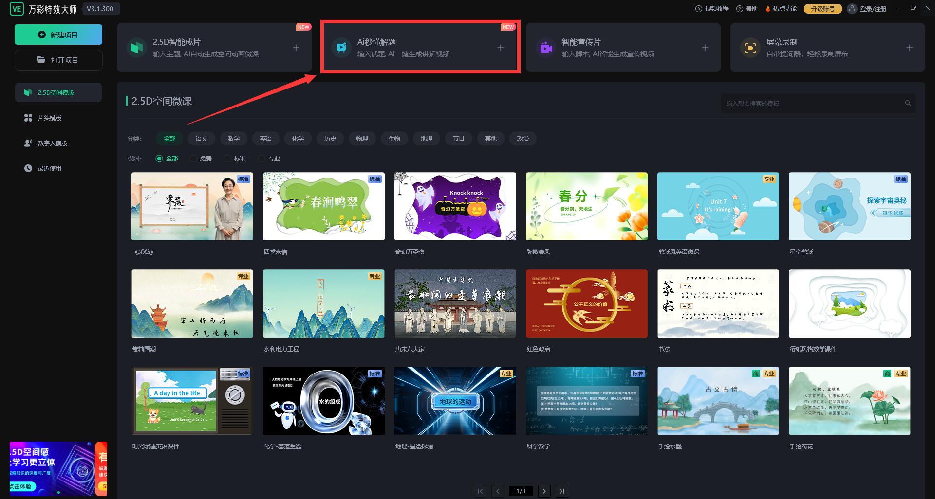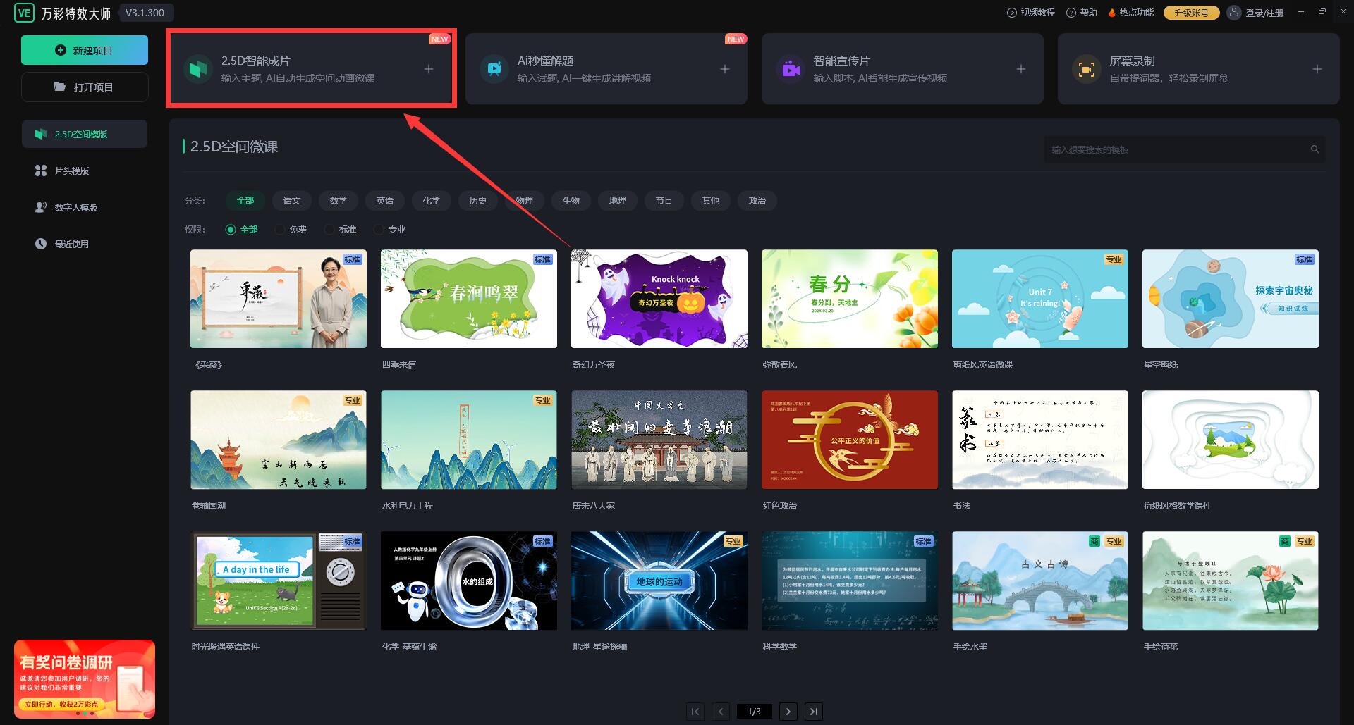 1、【NEW】2.5D智能成片:輸入主題、上傳文檔或PPT,一鍵智能生成精美“2.5D空間穿梭”效果的微課視頻,大幅提升制作效率
